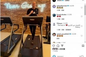 齐达内晒出自己在跑步机上健身的照片,他身后的墙壁上有“永不放弃”的字样。