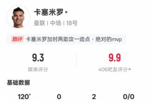 体育资讯4月18日讯 欧联杯1/4决赛次回合,曼联加时5-4里昂,总比分7-6晋级。本场比赛卡塞米罗首发出战,1次造点,贡献2次助攻,送出4次关键传球,评分9.3全场最高。