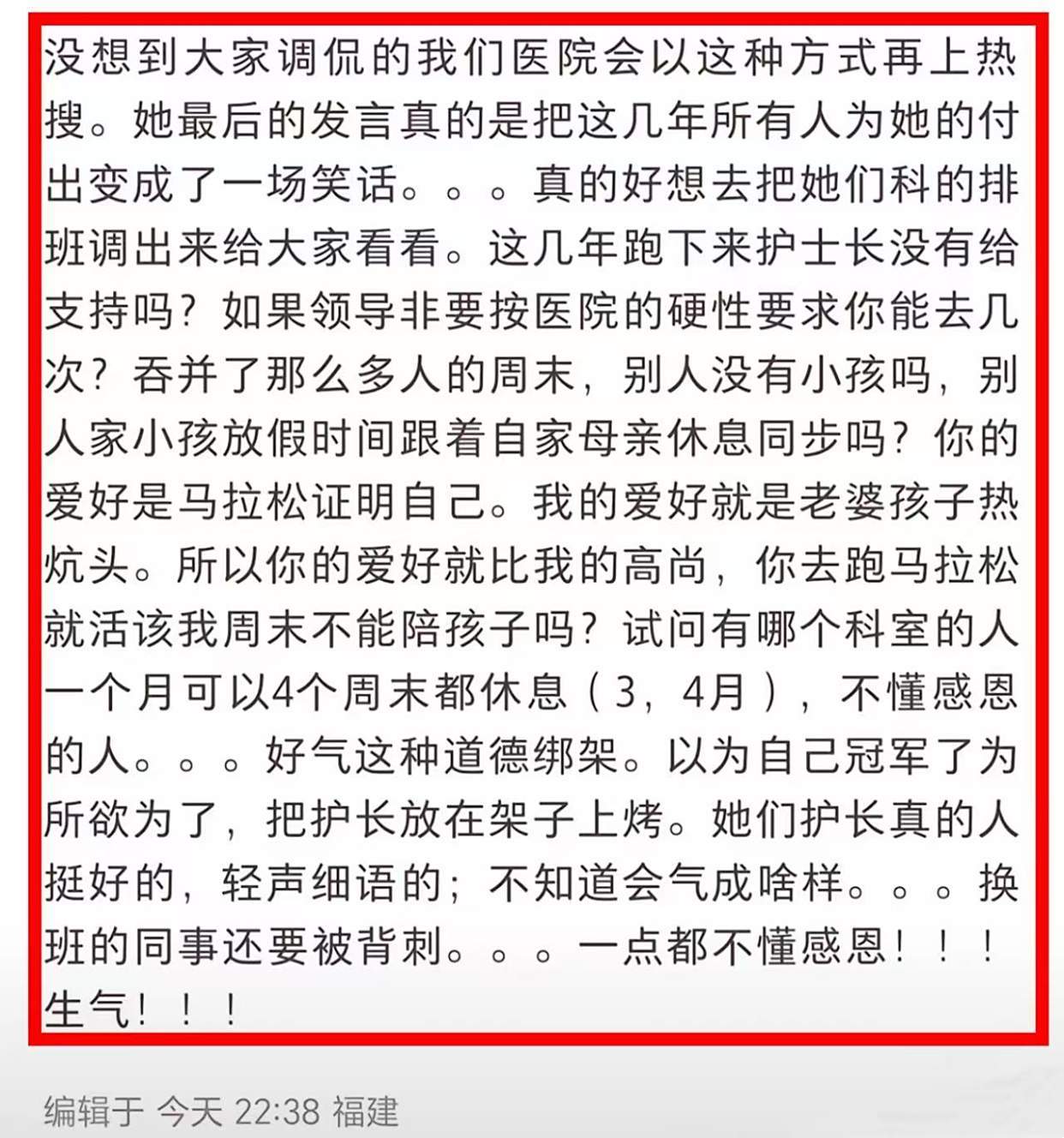 医护人员原本三班倒,这么频繁参加马拉松,这么频繁的调休,带入其同事的立场,真的是郁闷无比。